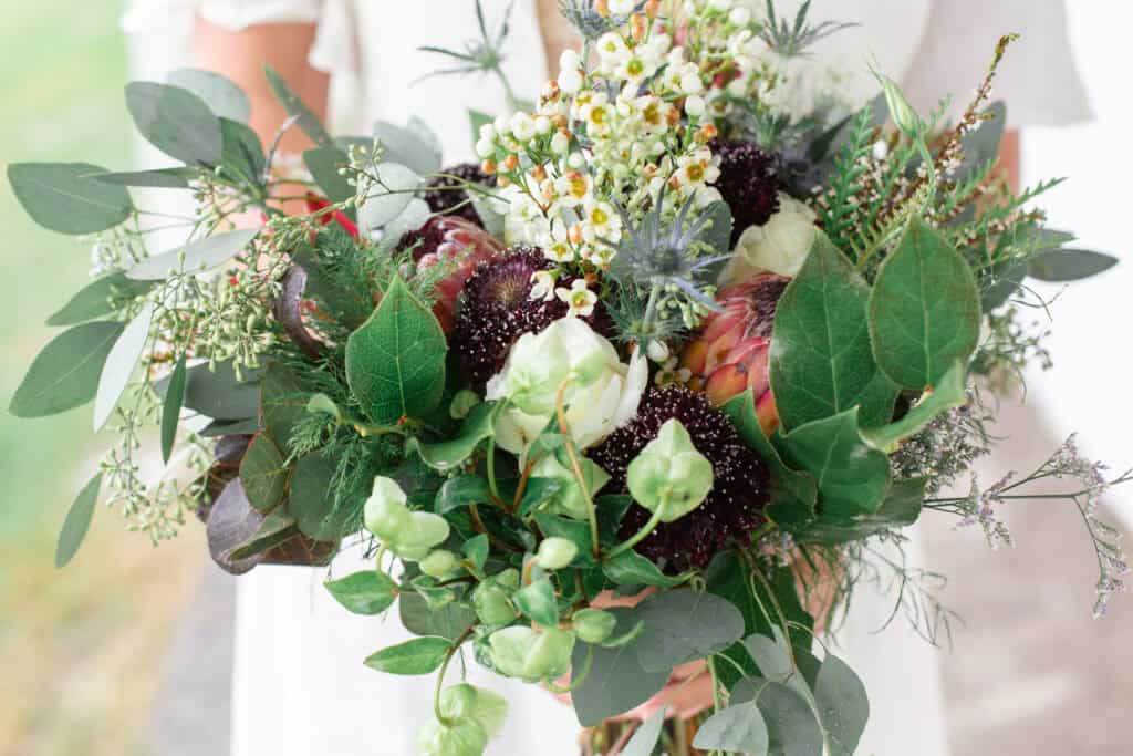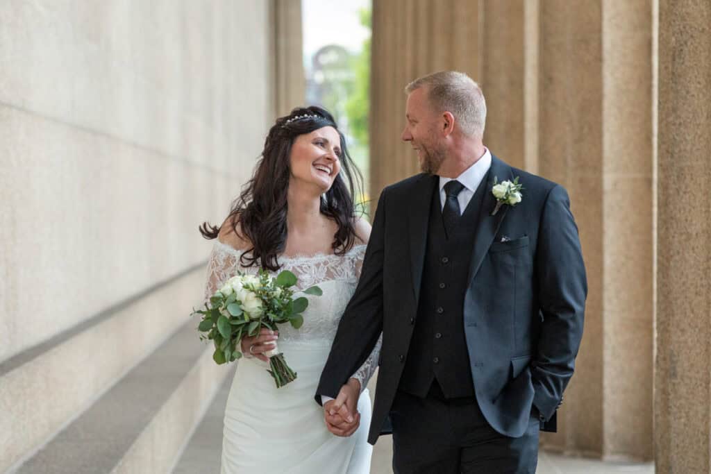 Bride in lace dress and jean jacket and groom in navy suit happily hugging in autumn near a lake in a Nashville park.